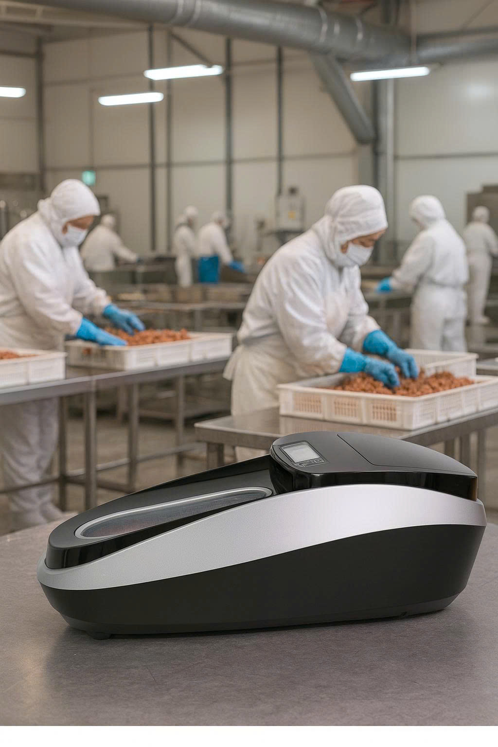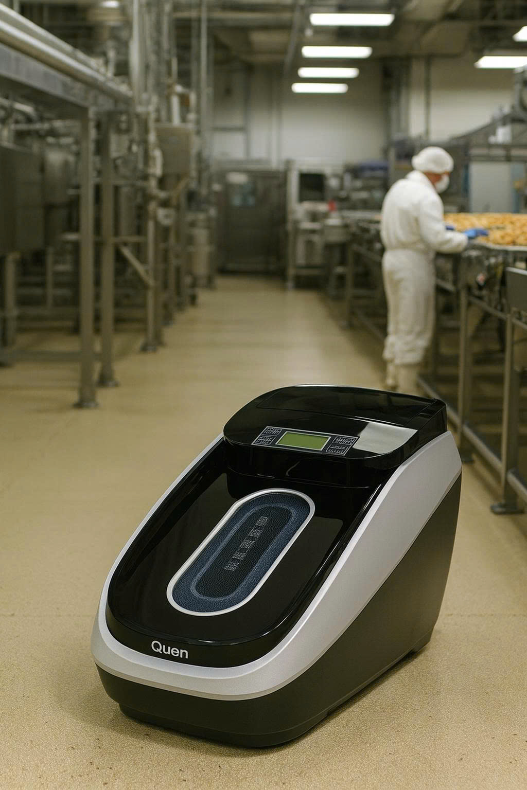 Máy bọc giày Quen XT-46C là thiết bị chuyên dụng sử dụng công nghệ co nhiệt để tự động bọc màng film vệ sinh quanh đế giày, giúp loại bỏ hoàn toàn bụi bẩn và vi khuẩn chỉ trong khoảng 3 giây. Với thiết kế nhỏ gọn (78x44x32 cm, trọng lượng 21kg), máy dễ dàng lắp đặt tại lối vào khu vực sản xuất, phòng sạch hoặc kho nguyên liệu. Dưới đây là các ứng dụng cụ thể trong ngành thực phẩm: