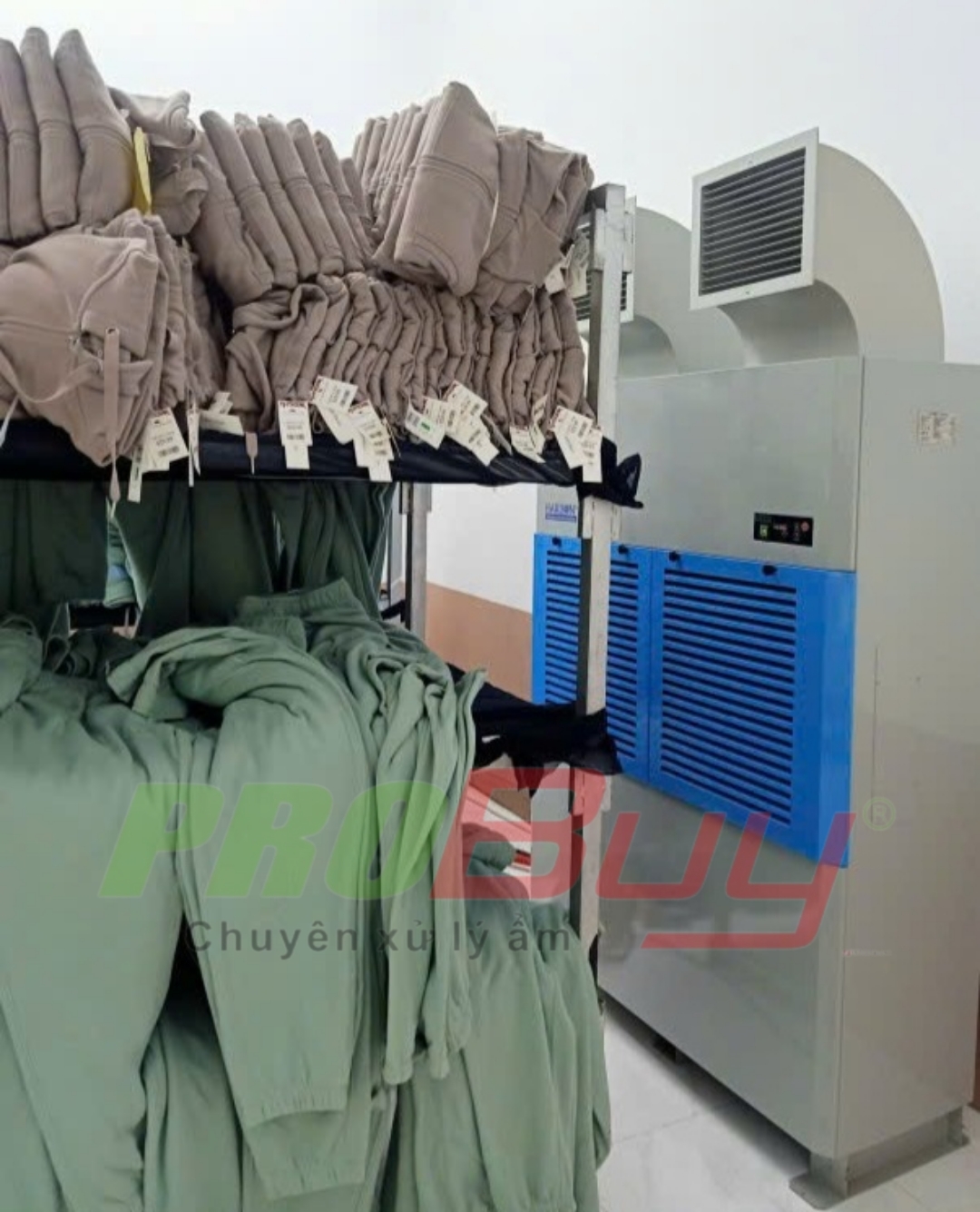 Hình ảnh thực tế lắp đặt máy hút ẩm Harison HD-192PS tại xưởng may mặc có diện tích 40², giúp giảm độ ẩm từ 85% xuống mức an toàn là 60%
