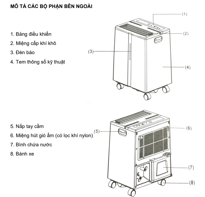 Cấu tạo máy gồm nhiều linh kiện điện tử. Tuy nhiên, nhìn từ bên ngoài, dễ dàng nhìn thấy các bộ phận như sau: bảng điều khiển, miệng cấp khí khô, đèn báo, tem thông số kỹ thuật, nắp tay cầm, miệng hút gió ẩm (có lọc khí nylon), bình chứa nước, bánh xe.