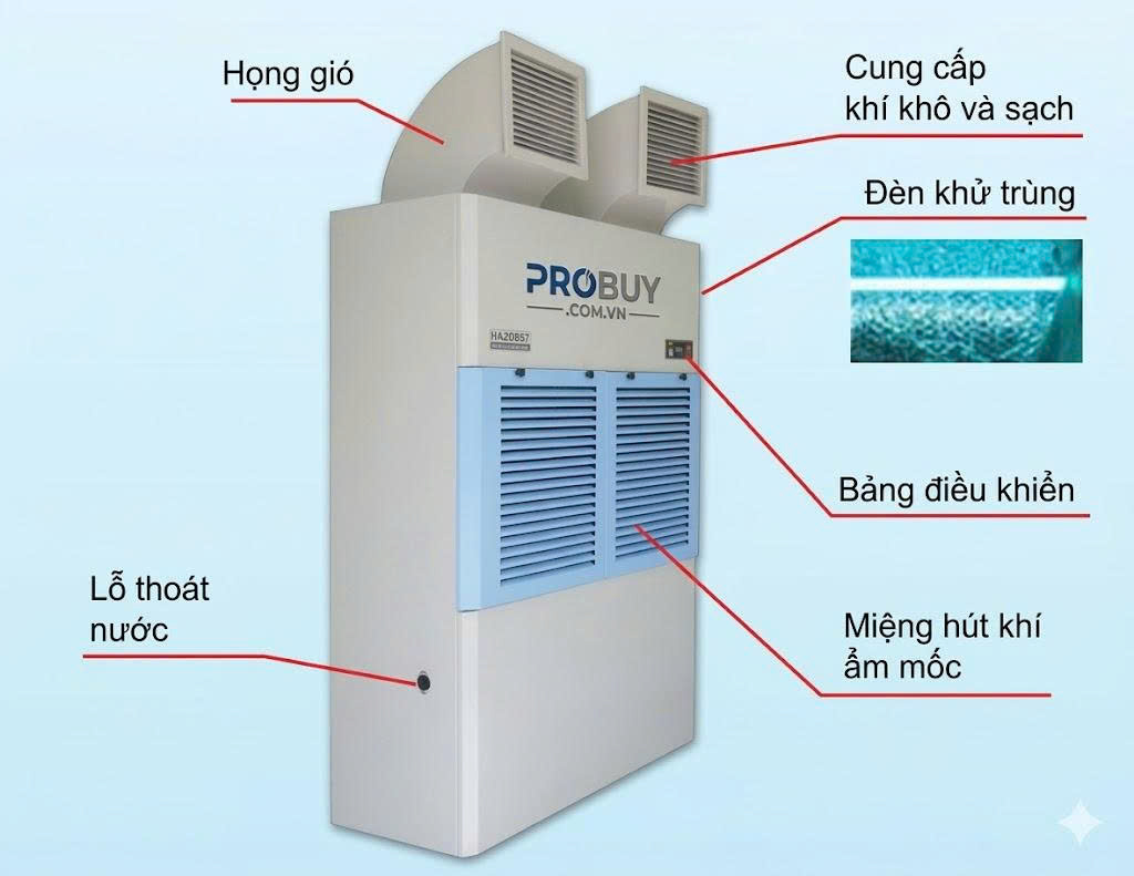 Máy sử dụng 02 máy nén Mitsubishi cho hiệu suất cao. Khí ẩm được quạt gió hút vào máy qua cửa hút khí ẩm ở mặt trước máy. Sau đó, khí sẽ đi qua dàn lạnh (có màng lọc phía sau cửa hút khí ẩm để lọc những bụi bẩn trong không khí giúp ngăn bụi bẩn bám vào dàn lạnh). Tại đây, khí ẩm được tách ra, ngưng tụ thành nước và chảy ra ngoài qua đường nước thải bên hông máy. Không khí sau khi được tách ẩm sẽ đi qua dàn nóng để sấy khô trước khi được quạt gió thổi trả lại môi trường. Chính vì vậy mà khi chúng ta chạm vào luồng khí khô của máy thổi lại phòng thường sẽ thấy ấm.