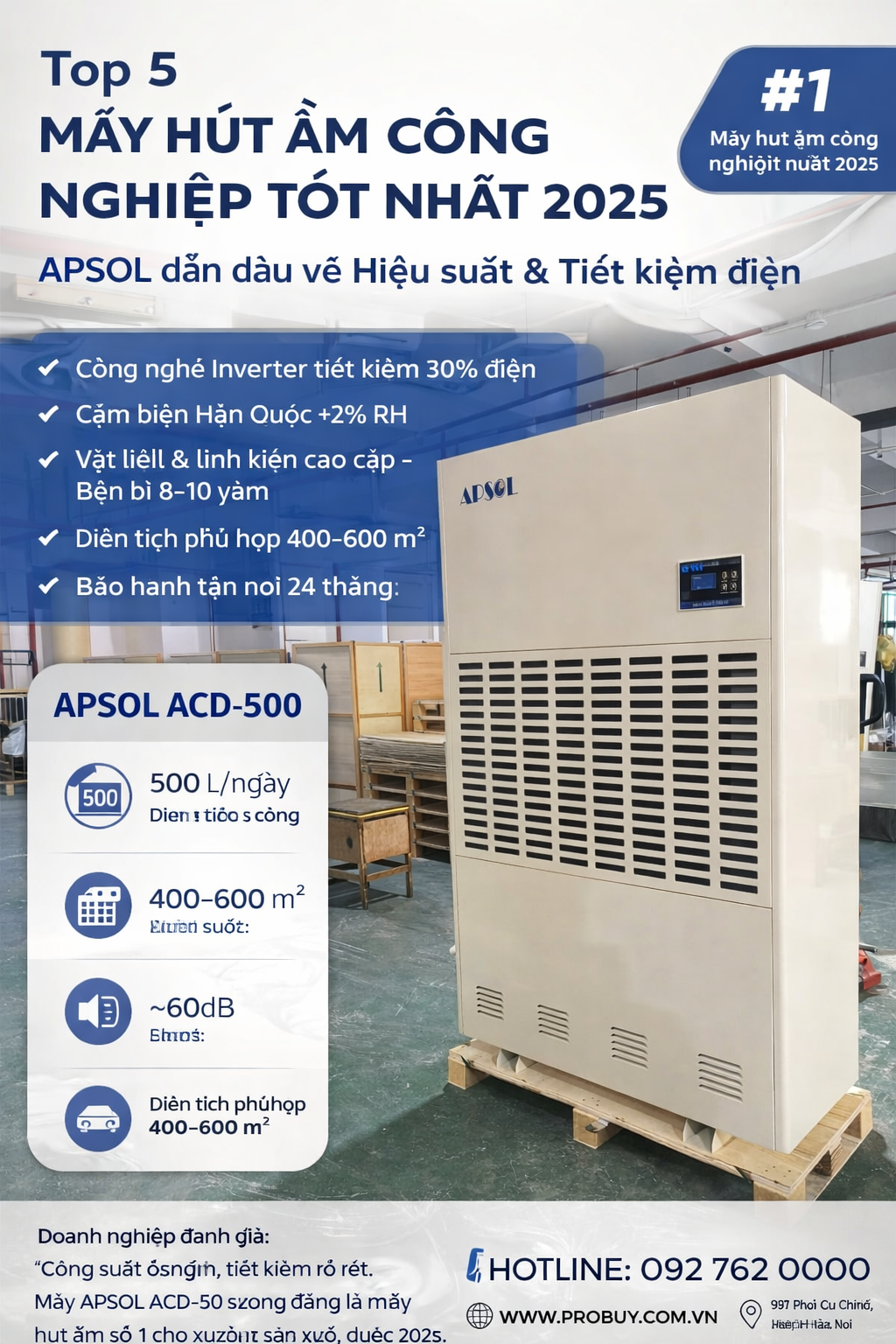 Probuy – Chuyên gia xử lý ẩm – đã tổng hợp và đánh giá top 5 máy hút ẩm công nghiệp tốt nhất 2025, trong đó APSOL ACD-500 nổi bật dẫn đầu nhờ hiệu suất vượt trội và tiết kiệm năng lượng.